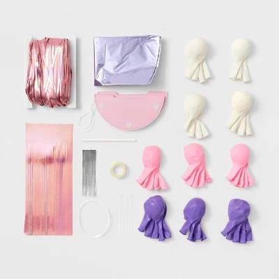 Decorate like a pro with the 54ct Large Balloons Arch with Backdrop From Spritz™. Following the latest party trend, this set includes illustrated instructions to build out a feature backdrop with a metallic fringe curtain and balloon arch. The pink and purple colors are great for everything from birthdays to weddings, and will offer picture perfect style for your next big event. The Balloons Arch with Backdrop from Spritz can be attached to party banner, walls, doorways, banisters and more to bring an extra twinkle to the party.