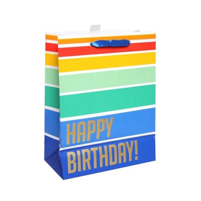 Planning on making a birthday special? Then this Adult Birthday Bag from Spritz™ is what you need. This bag is a perfect way to add a fun touch to your gift-giving gestures. It’s designed with vibrant colored stripes and a “Happy Birthday” text in gold foil accents. This bag also features strong ribbon handles for easy carrying. You can even fold the bag to store it for future use. Top it off with some colorful tissue paper and you are ready to share a gift that everyone hopes has their name on it.