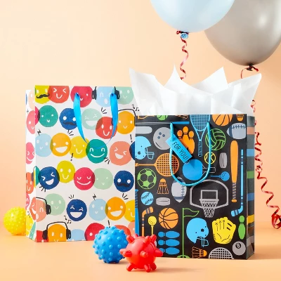 When you’re looking to wrap a birthday gift for someone in your life, having the Kids Birthday Large Cub Happy Dots from Spritz™ on hand makes it simple and easy. This multi-color gift bag features a fun happy smiles print all over and makes for an eye-catching design. Add to the festive feel, by coordinating with the tissue paper color of your choice. The cheerful Spritz™ birthday large cub happy dots bag comes with two convenient handles, making it simple to carry and giving you an easy alternative to time-consuming gift wrapping and decoration.