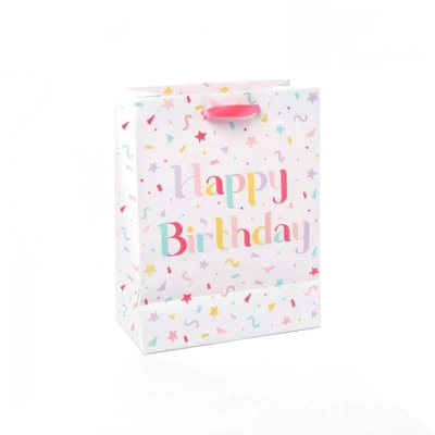 Add a fun twist to your birthday present with this Medium Birthday Gift Bag with Glitter from Spritz™. Adorned with ”Happy Birthday” written on glitter detailed stars and party hats for charming flair, this medium paper gift bag is the perfect size for any medium to small gift, and is great for birthday presents. Plus, the soft fabric handles make for easy carrying. Just pop the gift in and dress it up in a nest of matching tissue paper, and get ready to gift.