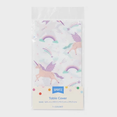 Get your table ready for your next party with this Unicorn Print Rectangular Table Cover from Spritz™. This table cover offers you a base to set the table for your kids’ parties while ensuring your table stays protected from spills or stains. With simplistic unicorn prints all over, this table cover adds a pop of fun to your celebrations. Pair it with colorful dinnerware, tableware and napkins to create an elegant display.
